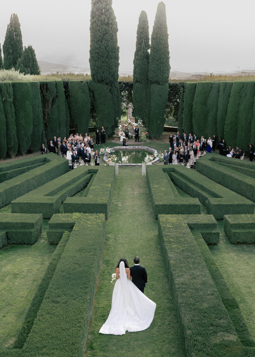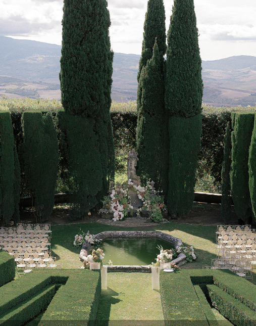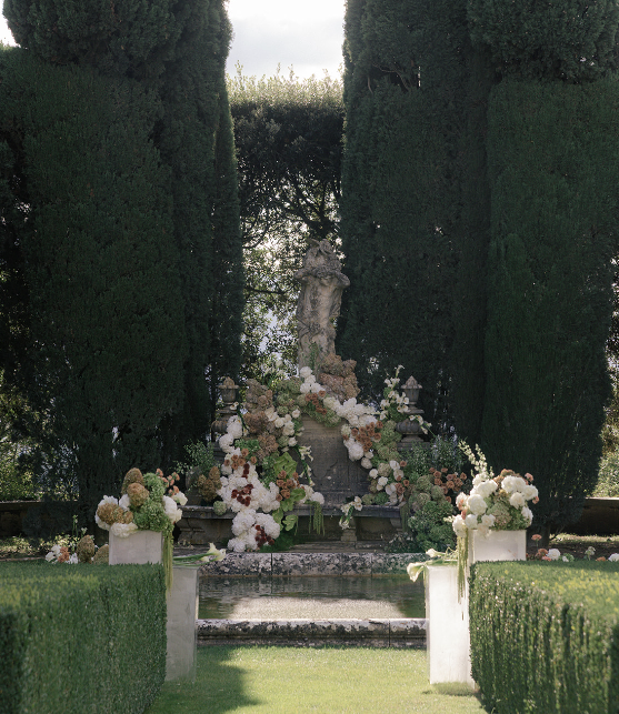 Steeped in centuries of history and framed by breathtaking panoramic views, this elegant 15th-century villa is surrounded by iconic Renaissance gardens designed by the famed architect Cecil Pinsent — with geometric hedges, lemon terraces, cypress-lined avenues and pergolas draped in wisteria that create a truly magical setting for your ceremony.